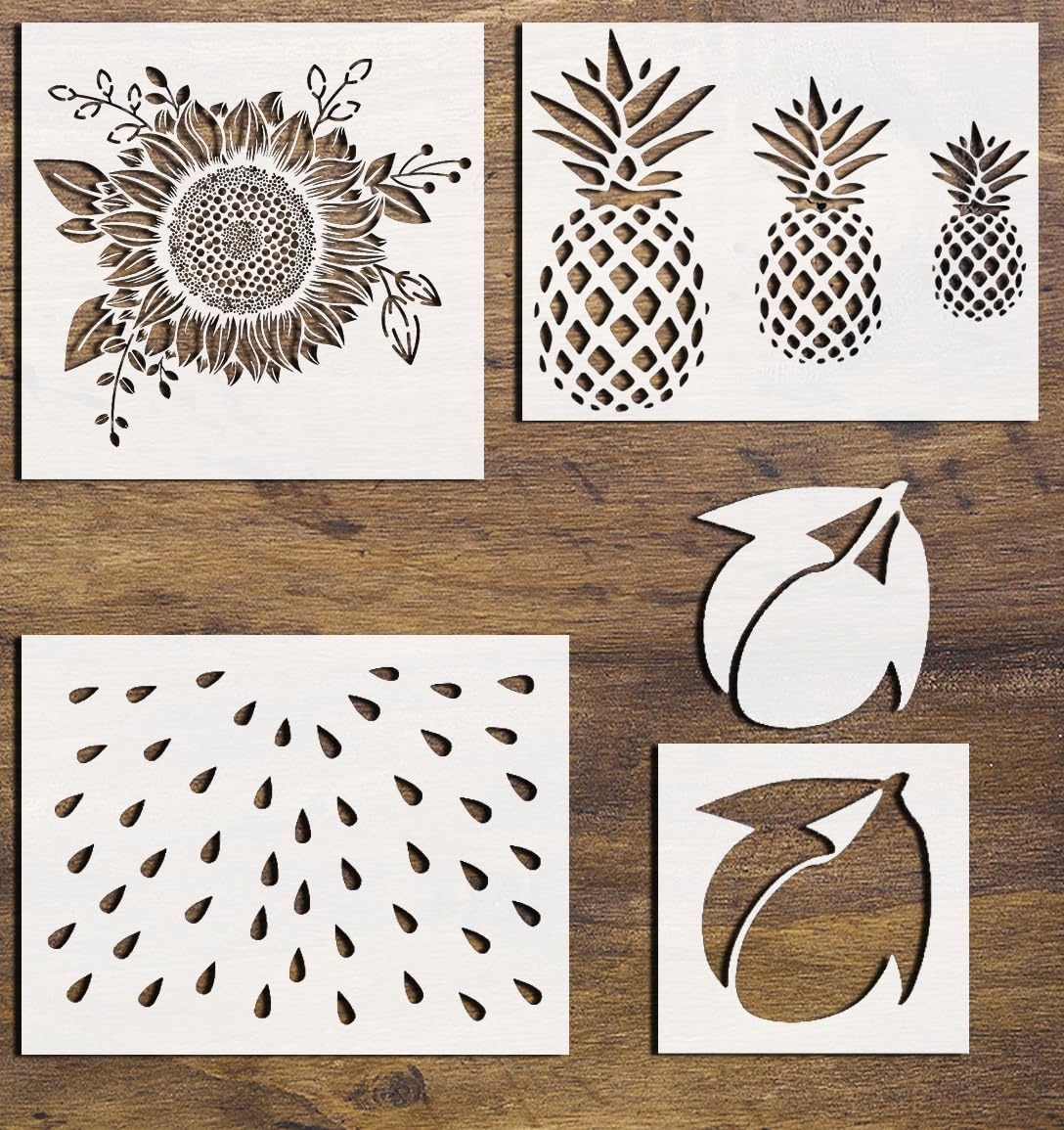 Professional 4-in-1 Fruit & Floral Stencil Set – Reusable Templates for DIY Painting on Walls, Wood, Fabric, and Crafts – Watermelon, Sunflower, Peach, and Pineapple Designs stencil for creating beautiful designs on various surfaces. Perfect for painting on wood, fabric, walls, and other materials. Reusable and durable for multiple projects.