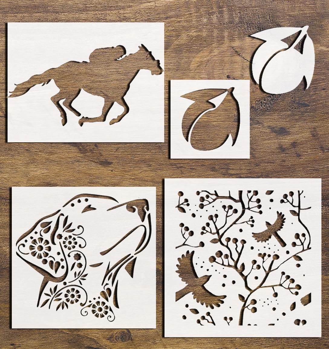 Professional 4-in-1 Reusable Stencil Set – Dog, Bird, Horse, and Peach Designs for Painting on Wood, Walls, Canvas, & DIY Crafts – Flexible Plastic Templates in Multiple Sizes stencil for creating beautiful designs on various surfaces. Perfect for painting on wood, fabric, walls, and other materials. Reusable and durable for multiple projects.