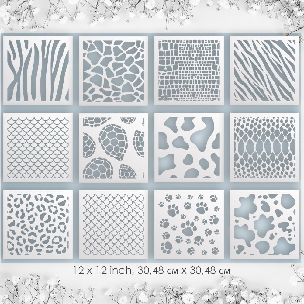 Professional Animal Skin Texture Stencils 12 Set – Reusable Print Stencils – Zebra, Crocodile, Snake, Tortoise, Scales, Leopard, Giraffe, Cow, Paw Prints, Painting Stencil Template for Scrapbooking, Drawing stencil for creating beautiful designs on various surfaces. Perfect for painting on wood, fabric, walls, and other materials. Reusable and durable for multiple projects.