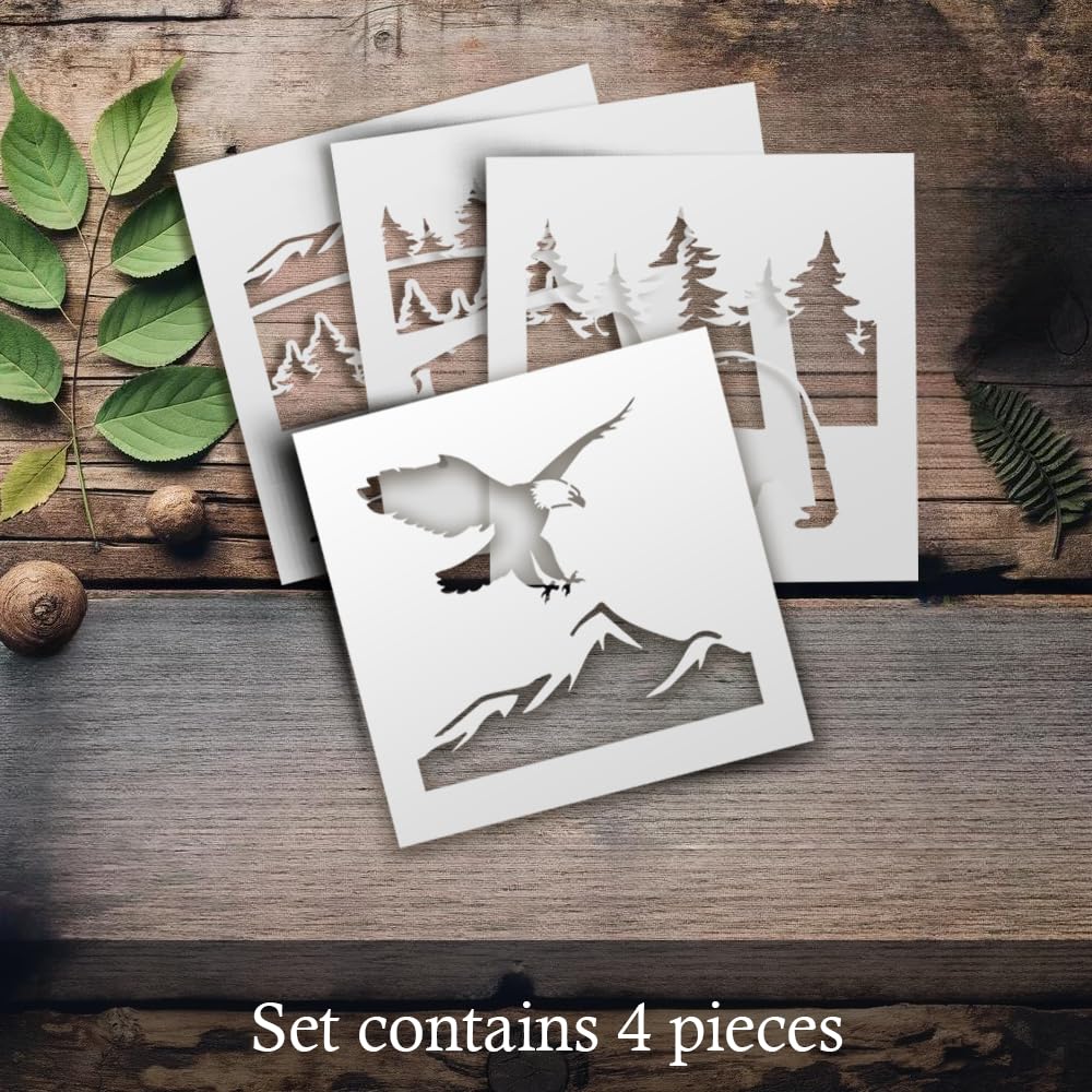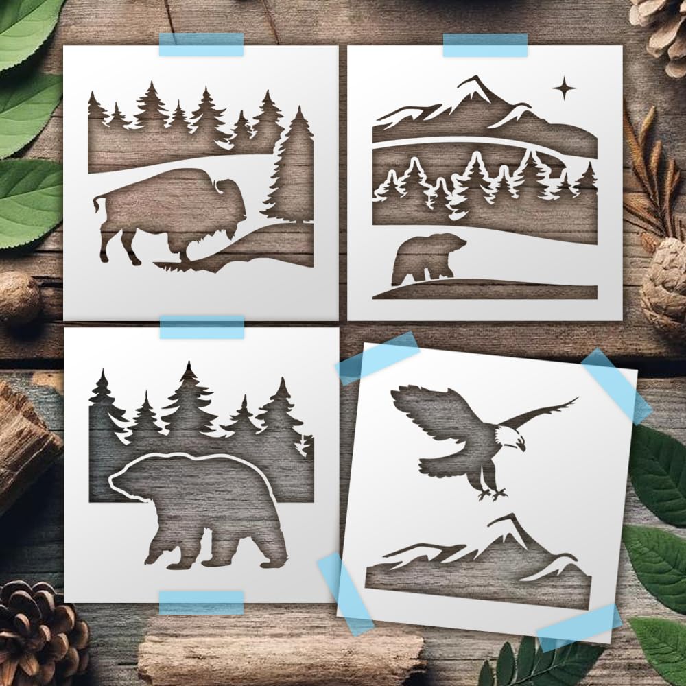 Professional Buffalo Wildlife Mountain Stencil Set – 4 Reusable Nature Scene Templates with Bear, Bison, Eagle & Forest Designs Rustic DIY Painting Stencils for Crafts, Wood Signs, Wall Art stencil for creating beautiful designs on various surfaces. Perfect for painting on wood, fabric, walls, and other materials. Reusable and durable for multiple projects.