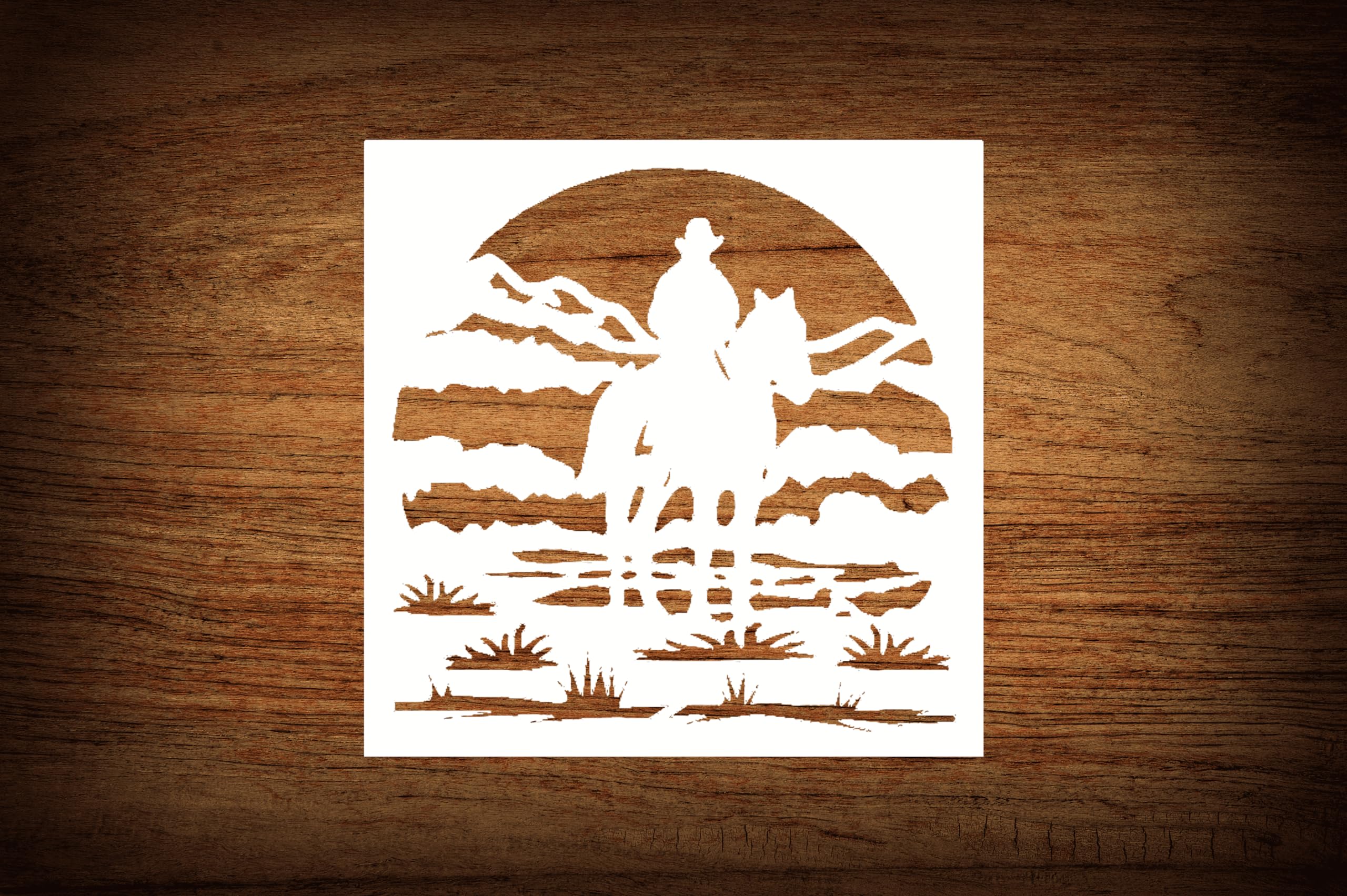 Professional Cowboy on Horse Stencil – Reusable Western Landscape Template with Mountains, Sunset & Prairie Scene – DIY Craft Stencil for Rustic Wall Art & Country Decor stencil for creating beautiful designs on various surfaces. Perfect for painting on wood, fabric, walls, and other materials. Reusable and durable for multiple projects.