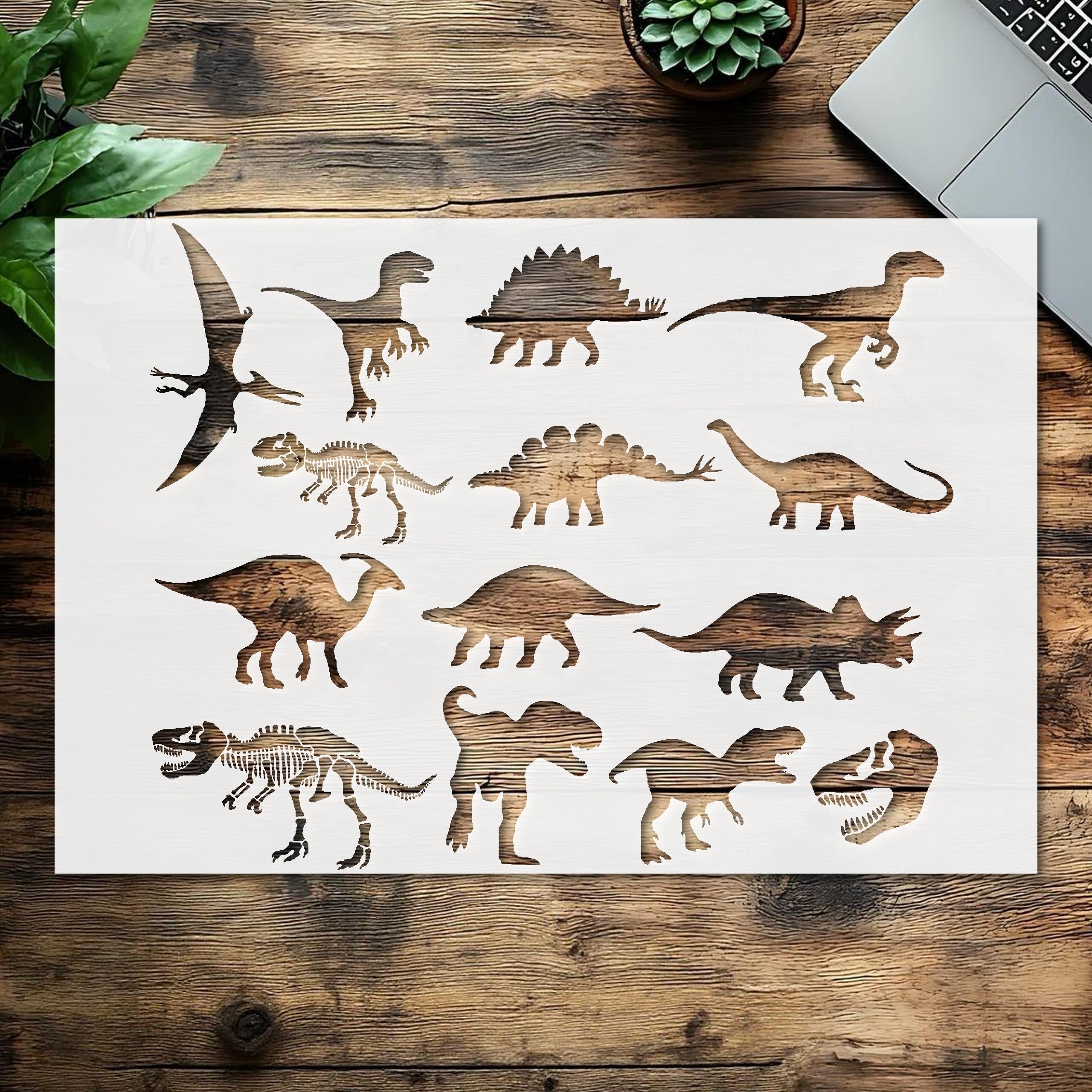 Professional Dinosaur Stencil Template Set, 14 Prehistoric Designs, stencil for creating beautiful designs on various surfaces. Perfect for painting on wood, fabric, walls, and other materials. Reusable and durable for multiple projects.