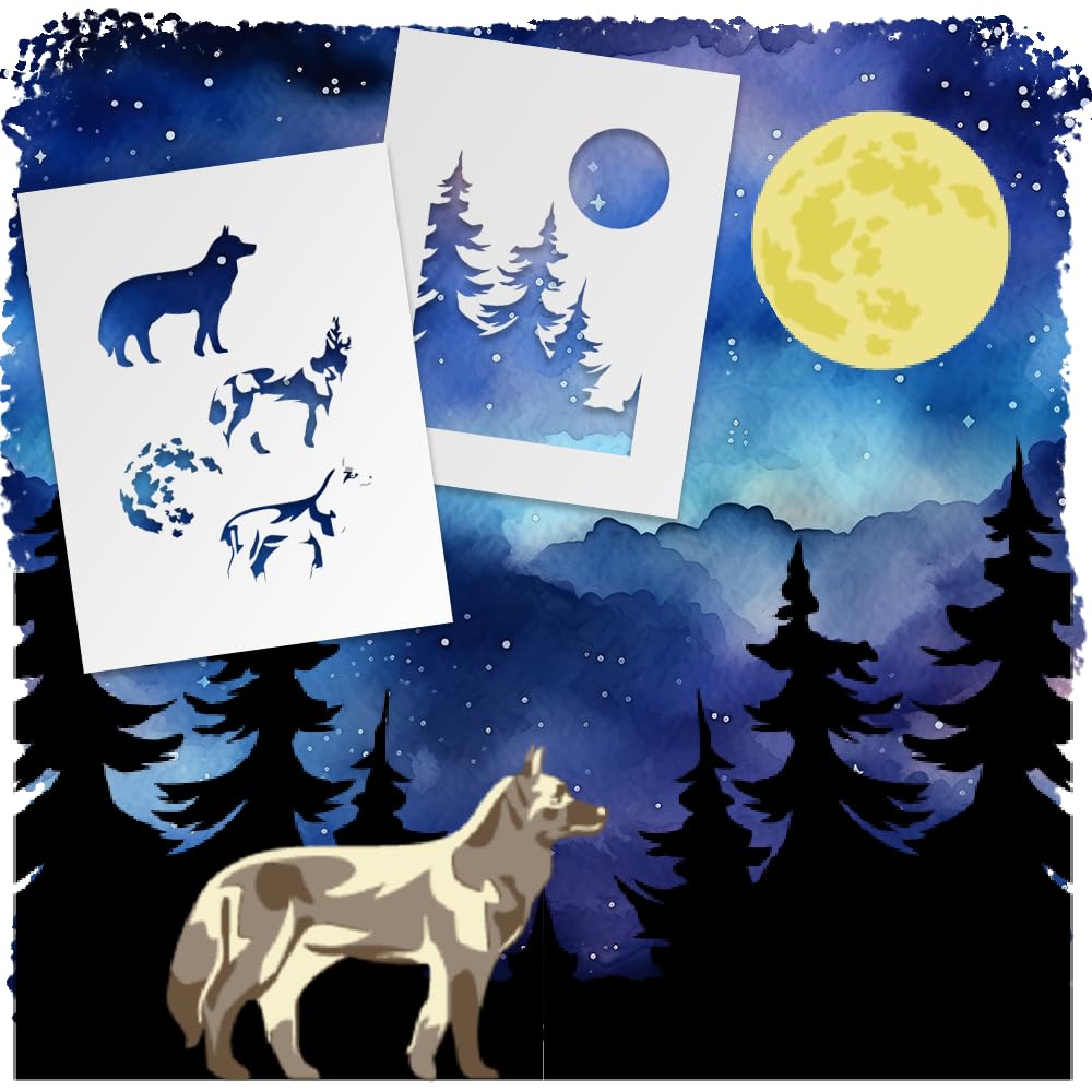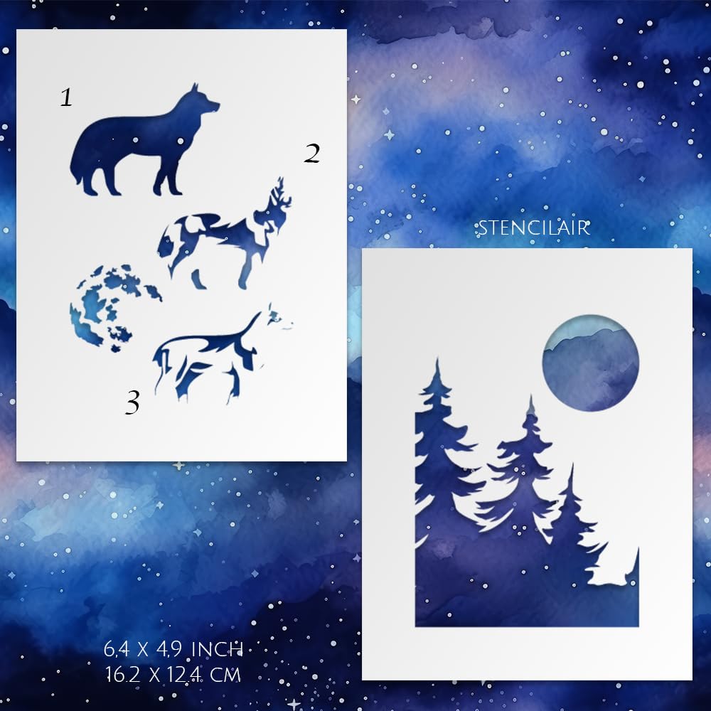 • Set of 2 Stencils: Includes two stencils – one featuring a majestic howling wolf and the other depicting a wolf pack in a forest setting, perfect for wildlife and nature-themed projects.