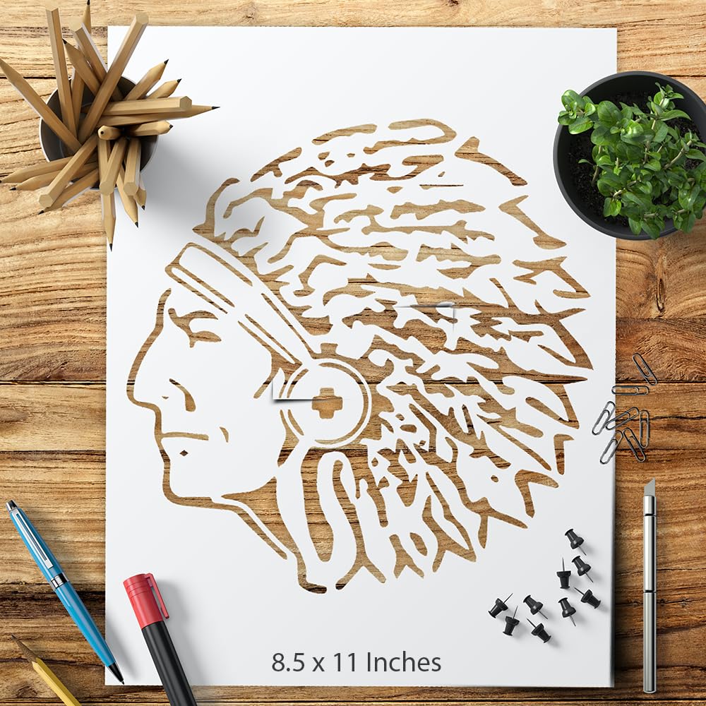 Professional Indian Chief Head Stencil Template – Reusable Plastic Sheet for Wall Art, Painting, Crafts, and DIY Projects stencil for creating beautiful designs on various surfaces. Perfect for painting on wood, fabric, walls, and other materials. Reusable and durable for multiple projects.