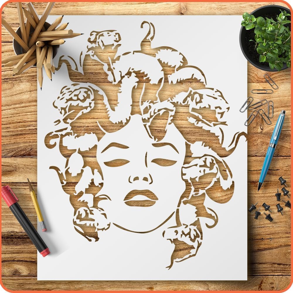 Professional Medusa Stencil for Painting – Reusable Plastic Template for DIY Art, Wall Decoration, Scrapbooking and Craft Projects stencil for creating beautiful designs on various surfaces. Perfect for painting on wood, fabric, walls, and other materials. Reusable and durable for multiple projects.
