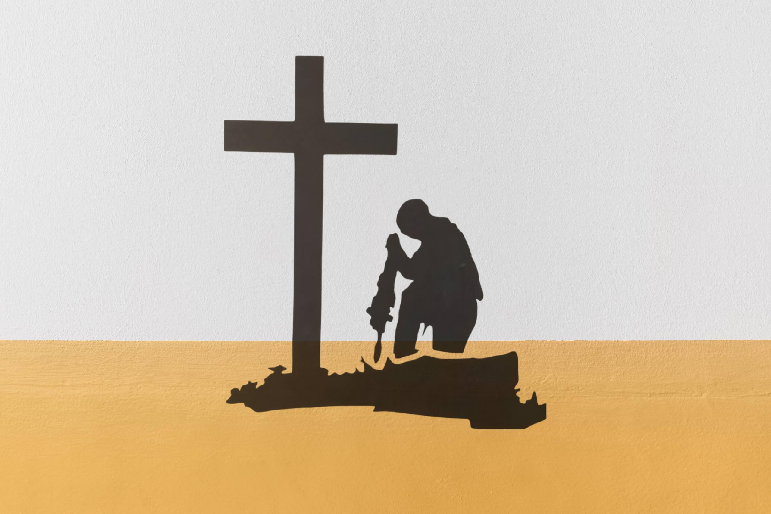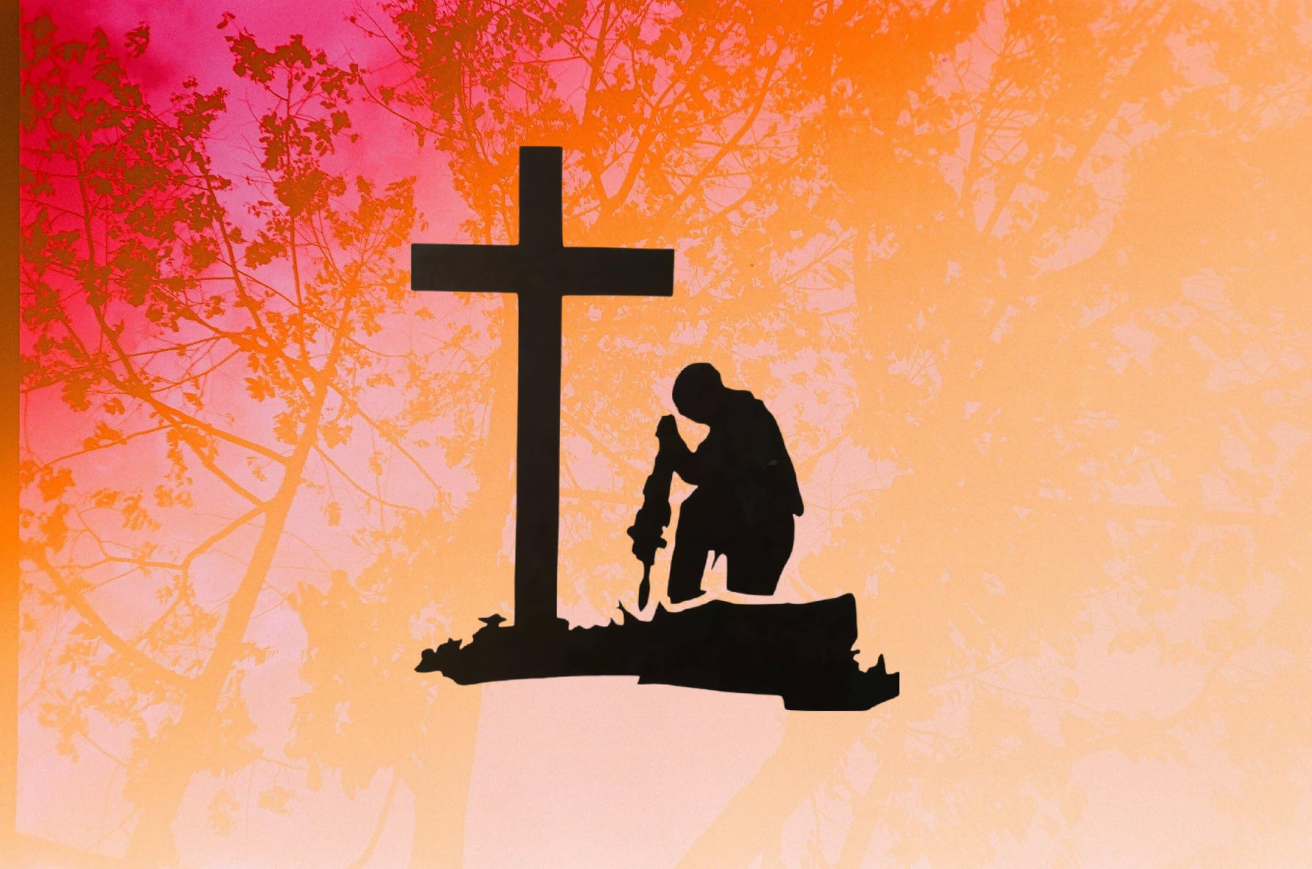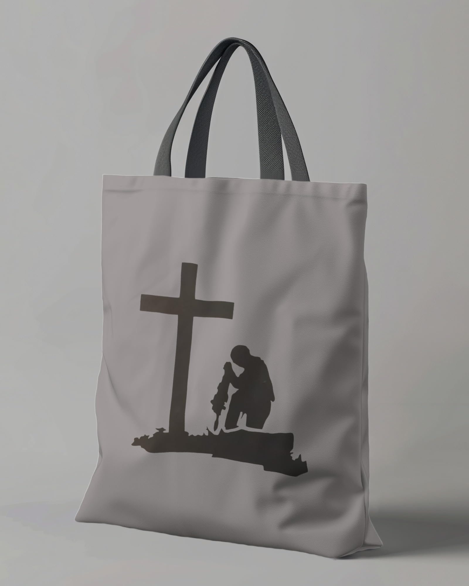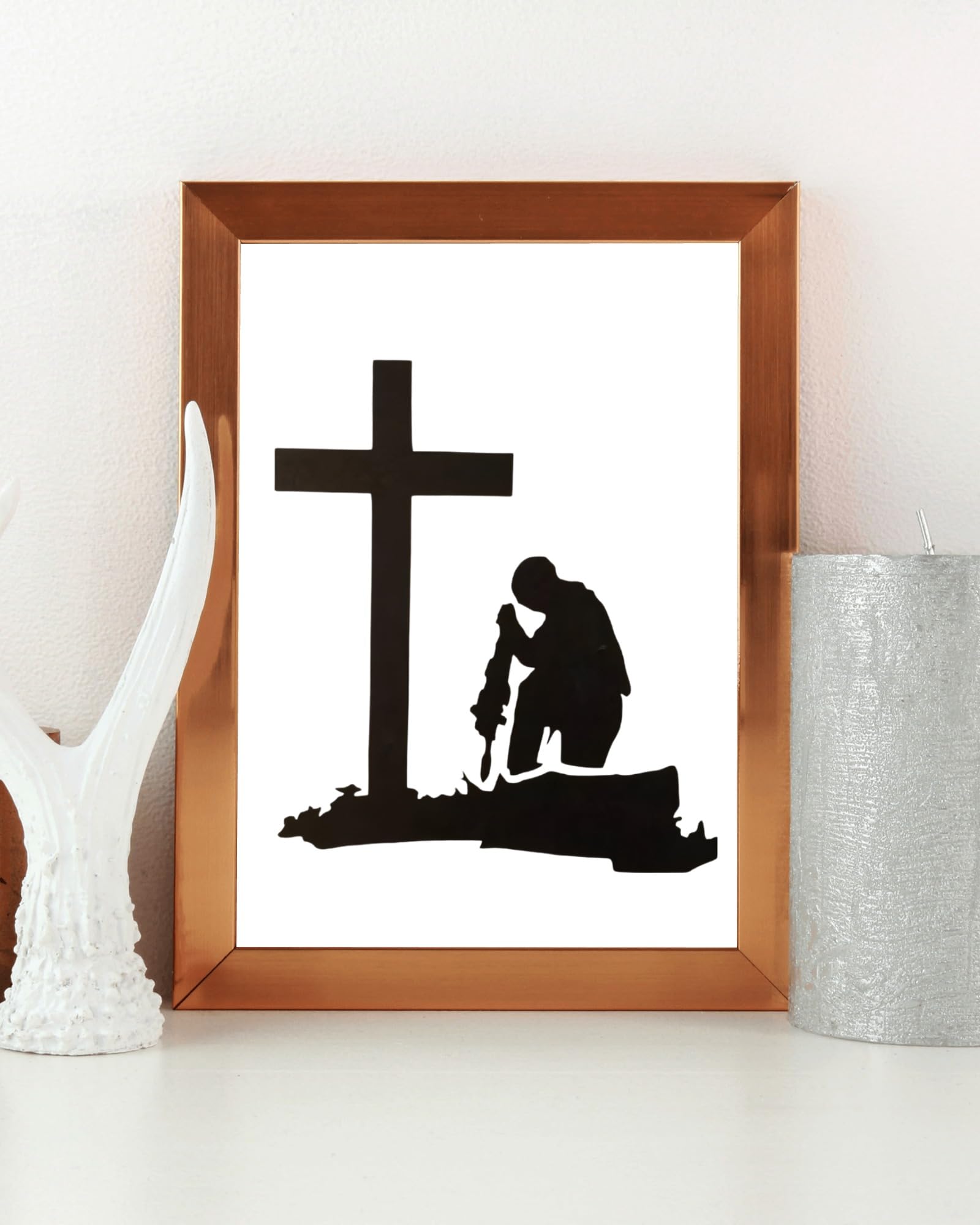• Poignant Design depicting a soldier kneeling at a cross, symbolizing respect and remembrance.