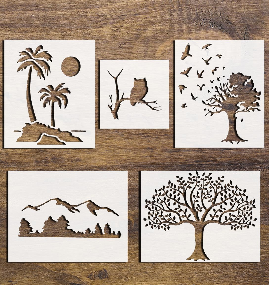 Professional Nature & Tree Stencil Bundle – Owl, Tree of Life, Birds in Tree, Mountains, & Palm Tree Stencils – Reusable Templates for DIY Crafts, Painting, & Wall Decor – 4-Inch to stencil for creating beautiful designs on various surfaces. Perfect for painting on wood, fabric, walls, and other materials. Reusable and durable for multiple projects.