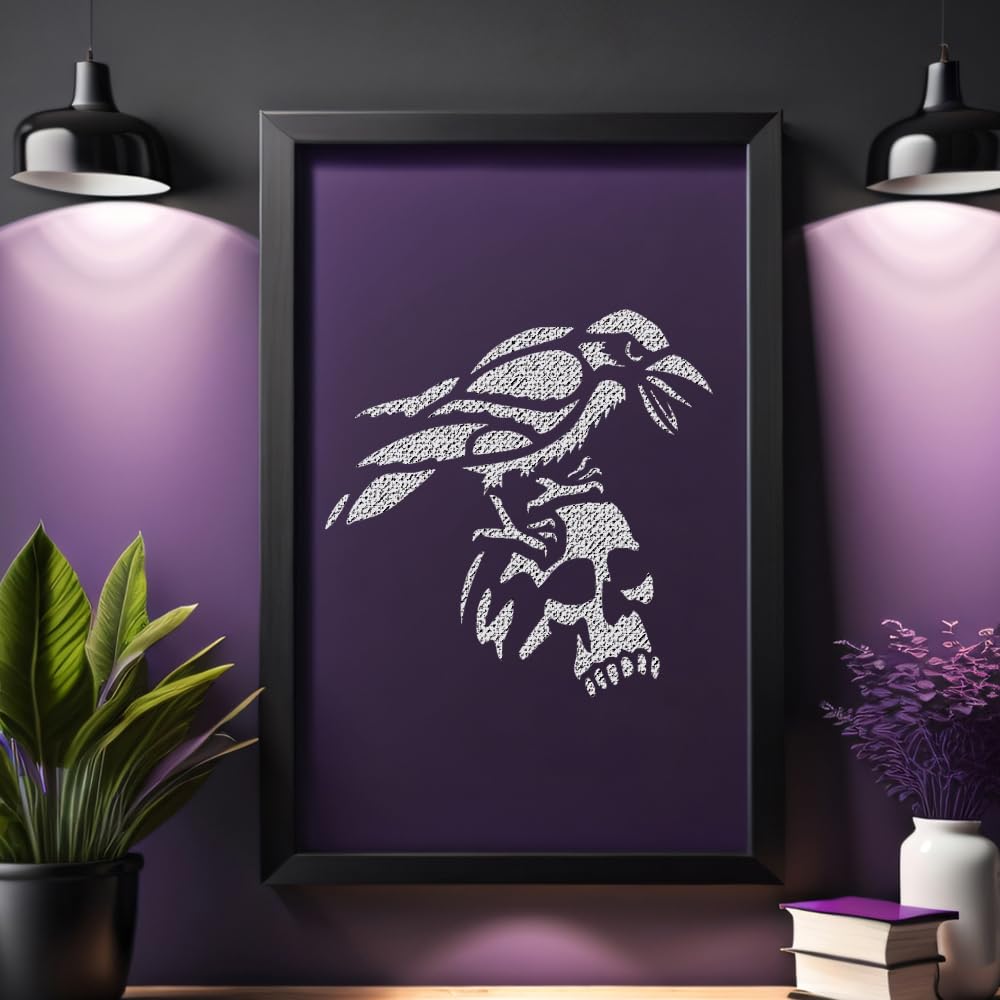 Professional Raven on The Skull Stencil for Painting, Reusable Mylar Plastic, stencil for creating beautiful designs on various surfaces. Perfect for painting on wood, fabric, walls, and other materials. Reusable and durable for multiple projects.