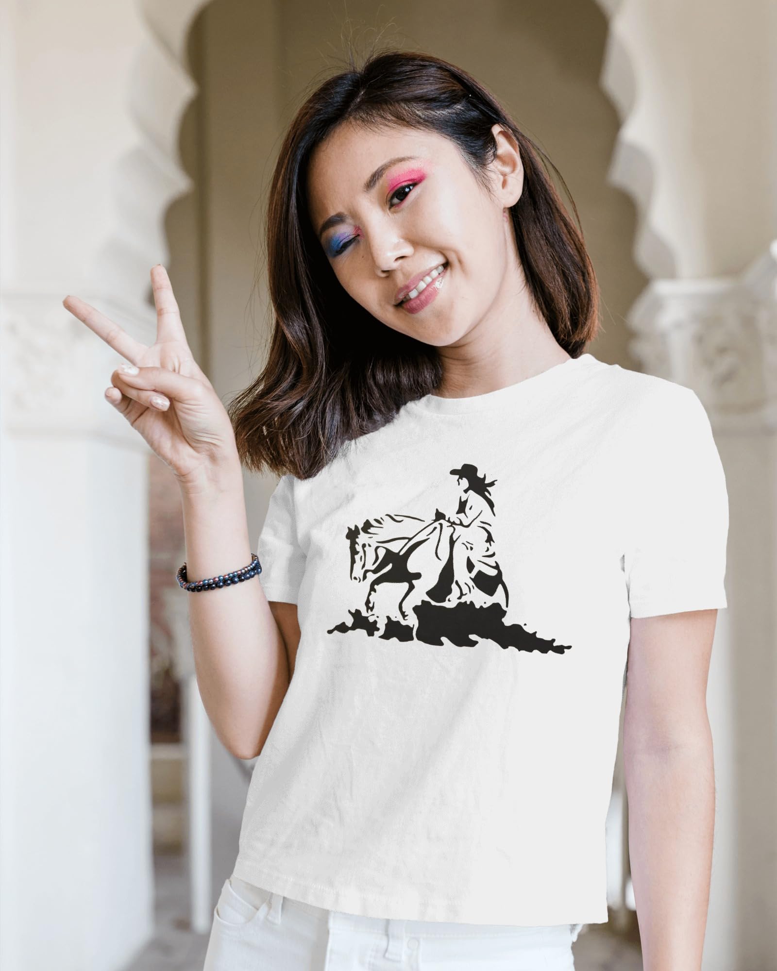 • Dynamic Cowboy and Cowgirl Riding Horse Design captures the essence of the Western spirit.