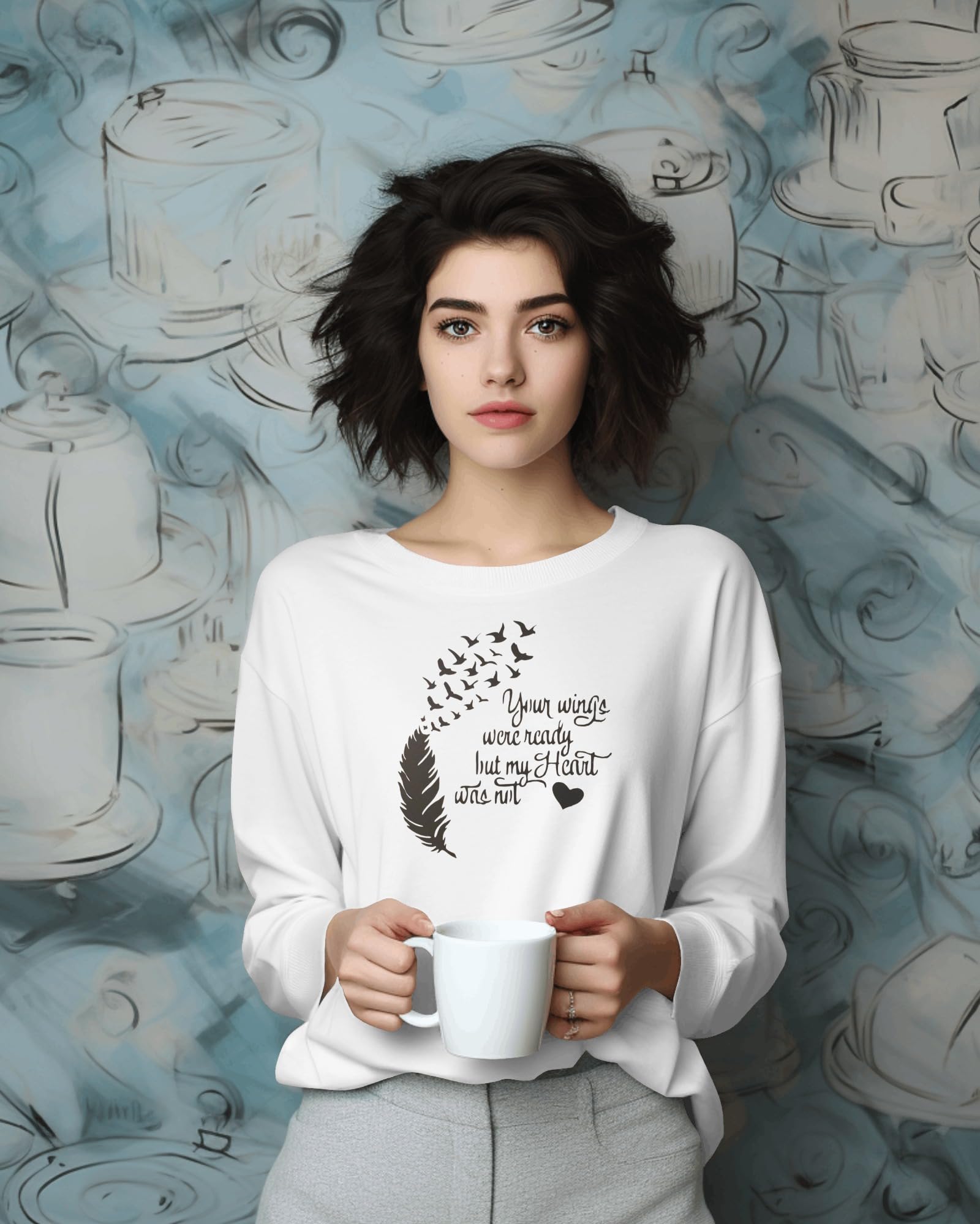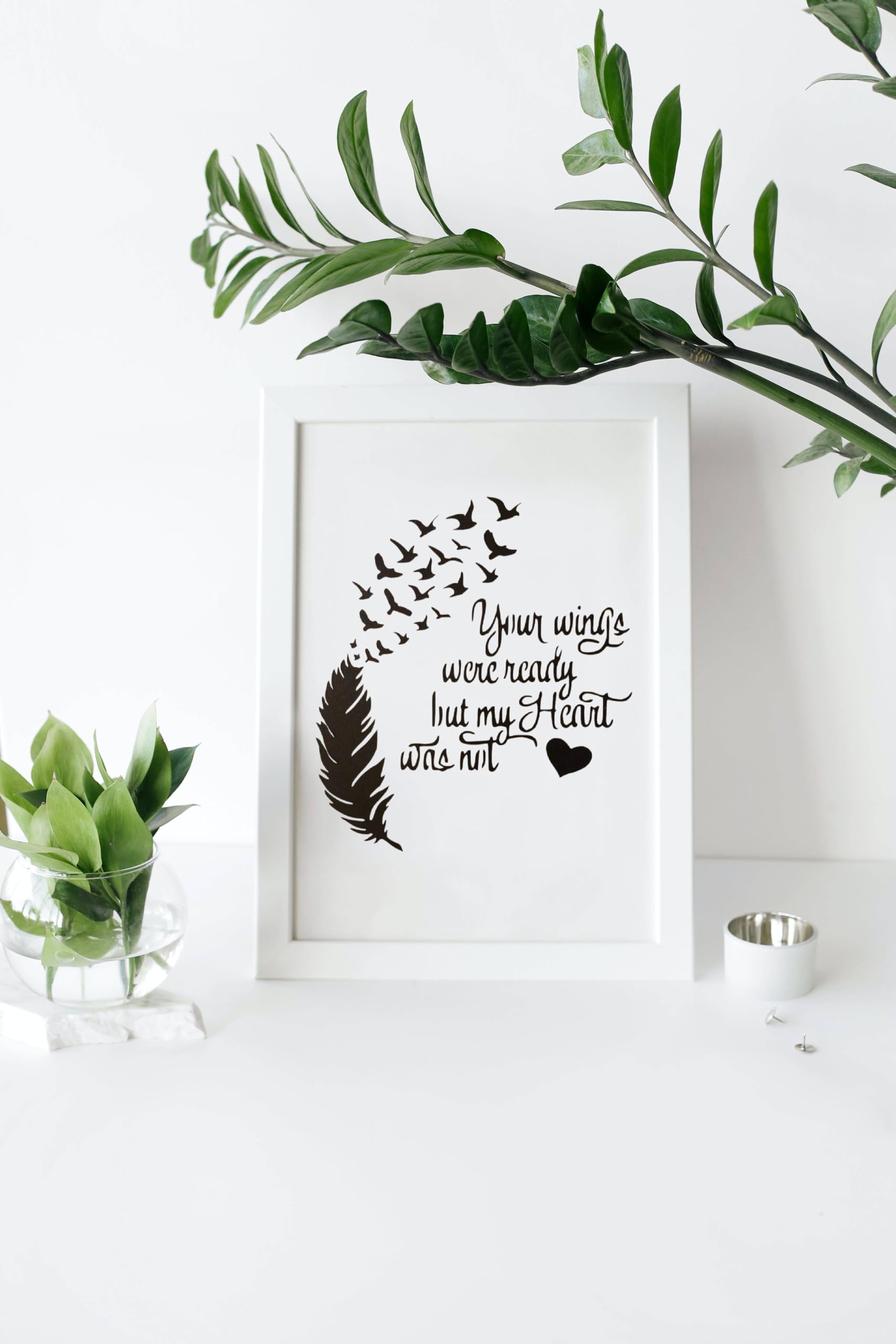 • Inspirational “Wings Ready, Heart Not” Quote with Feather & Birds Design for a poignant touch to projects.