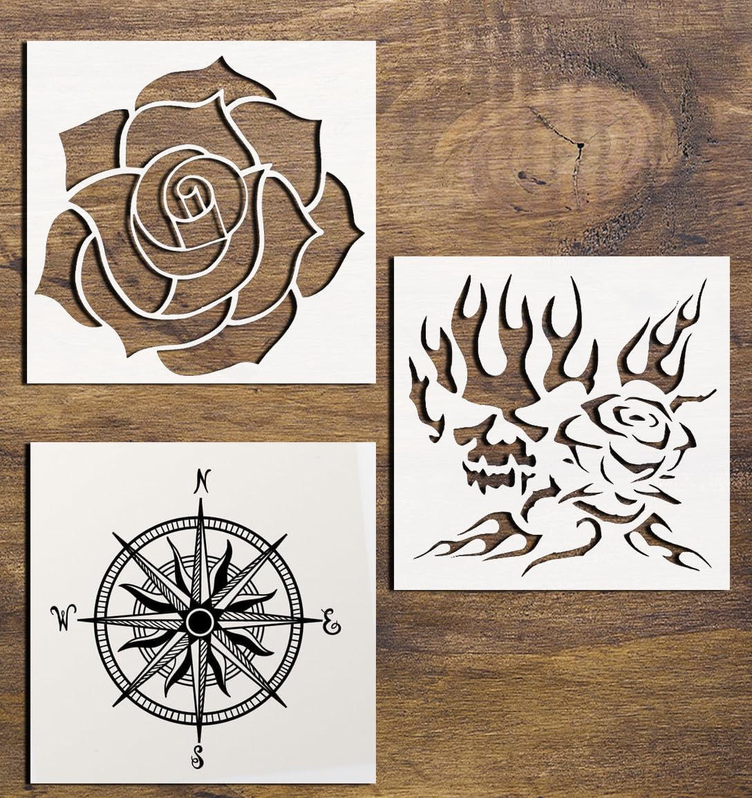 • Creative Stencil Bundle: Includes a Rose stencil, Grim Reaper with Skull & Flames stencil (), and a 12-inch Nautical Compass Rose stencil.