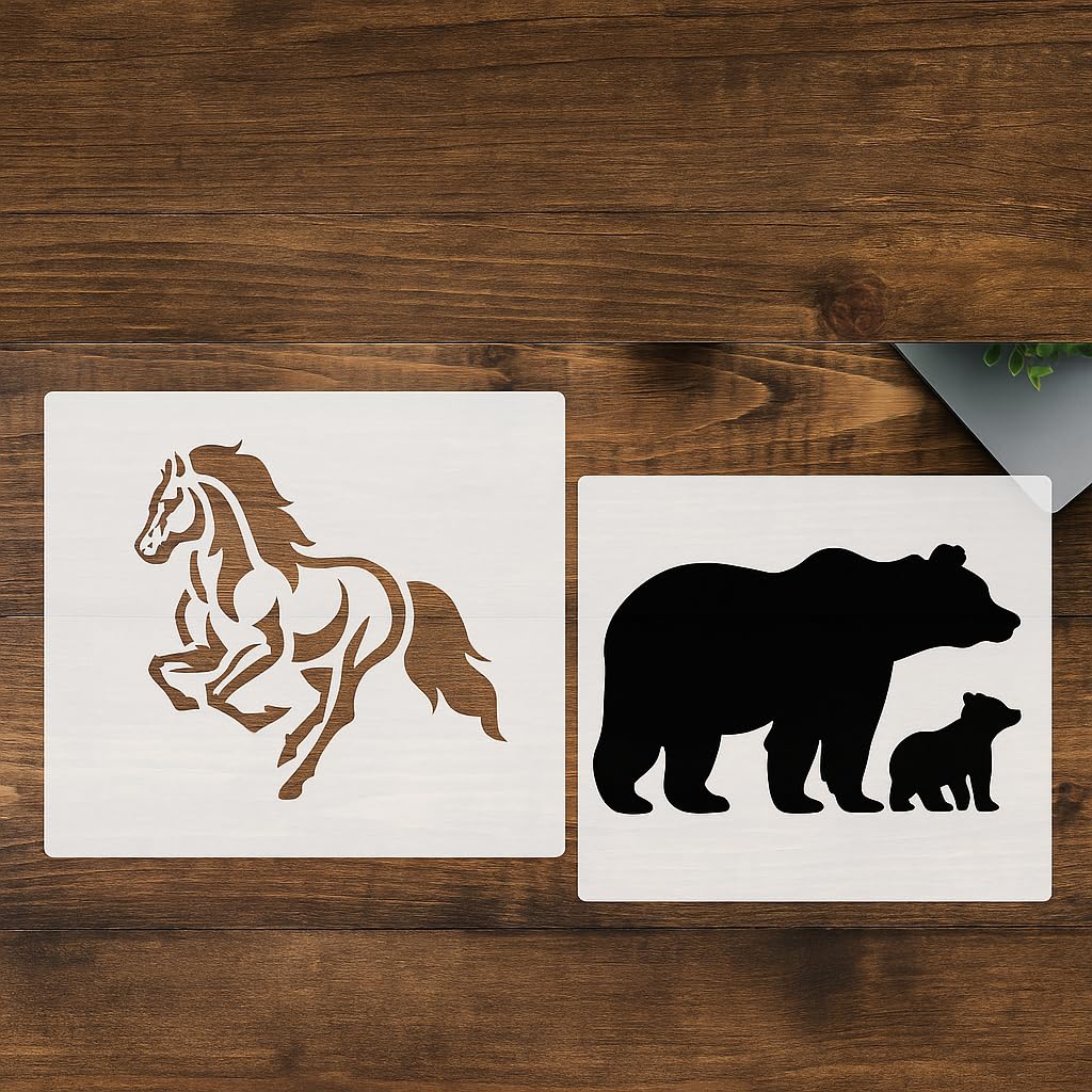 • Wildlife Stencil Duo – Includes dynamic Running Horse and tender Mother Bear with Cub designs, each sized “, ideal for adding nature-inspired art to any surface.