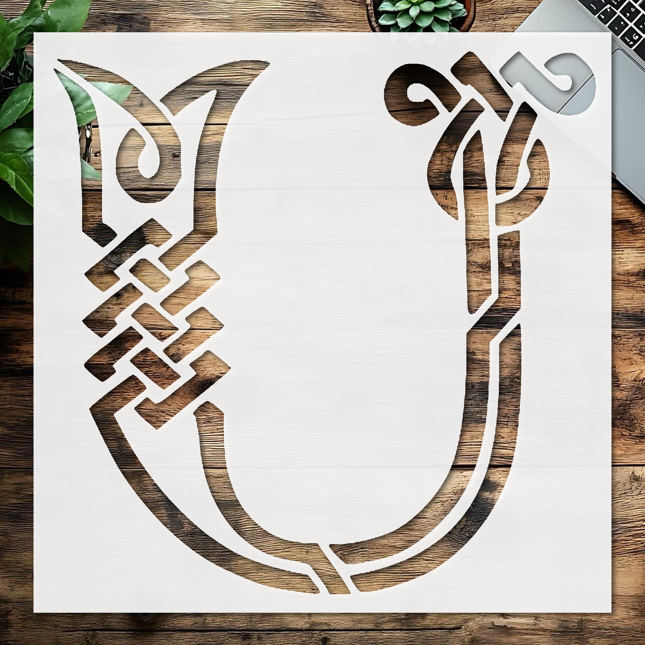 Professional Stencil Celtic Initial U, Plastic Reusable, Reusable Plastic, L x W, for DIY Crafts and Home Decor stencil for creating beautiful designs on various surfaces. Perfect for painting on wood, fabric, walls, and other materials. Reusable and durable for multiple projects.