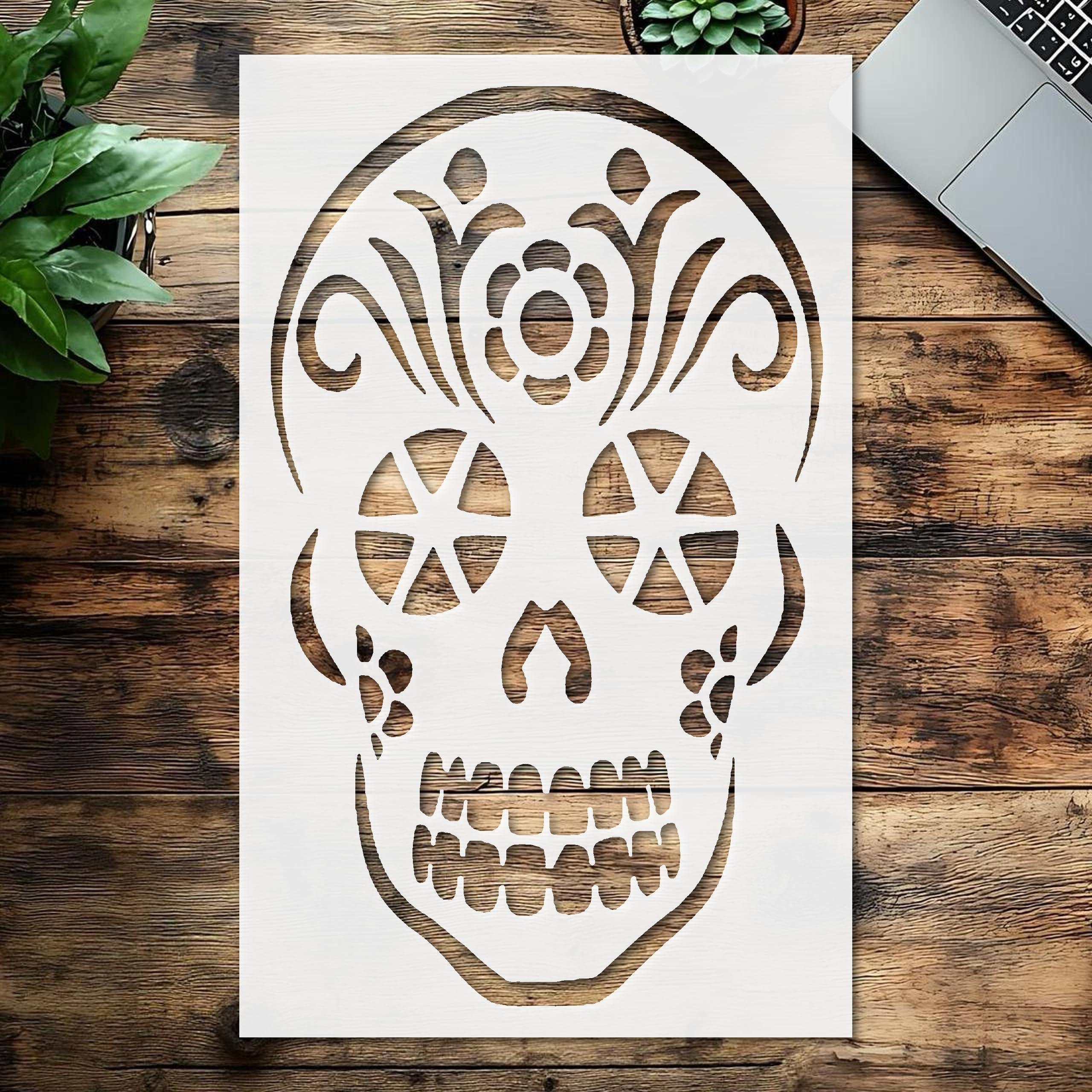 Professional Stencil Skull in Flowers, Plastic Reusable, Reusable Plastic, L x W, for DIY Crafts and Home Decor stencil for creating beautiful designs on various surfaces. Perfect for painting on wood, fabric, walls, and other materials. Reusable and durable for multiple projects.