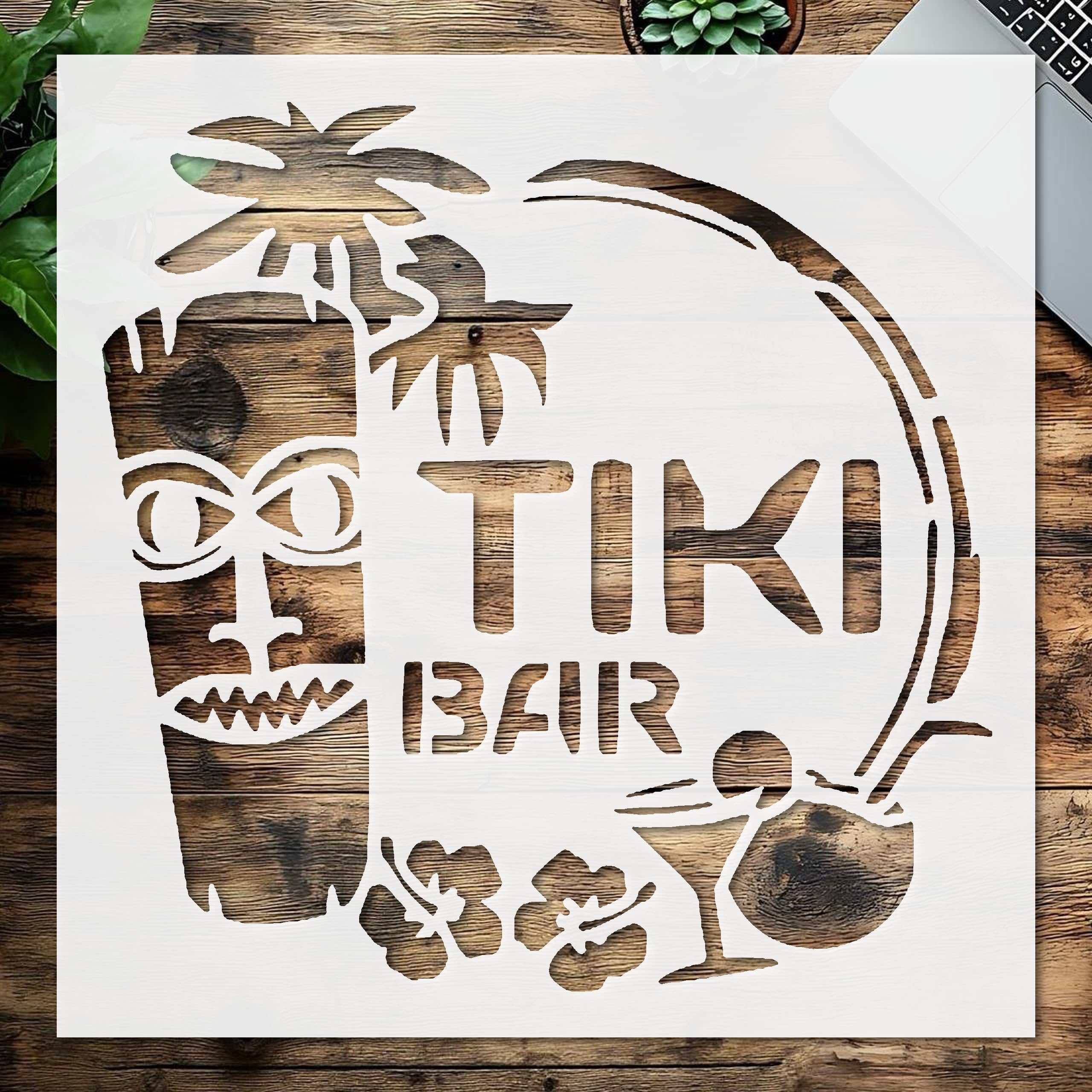 Professional Stencil Tiki Bar Totem Cocktail Sign, Plastic Reusable, Reusable Plastic, L x W, for DIY Crafts and Home Decor stencil for creating beautiful designs on various surfaces. Perfect for painting on wood, fabric, walls, and other materials. Reusable and durable for multiple projects.