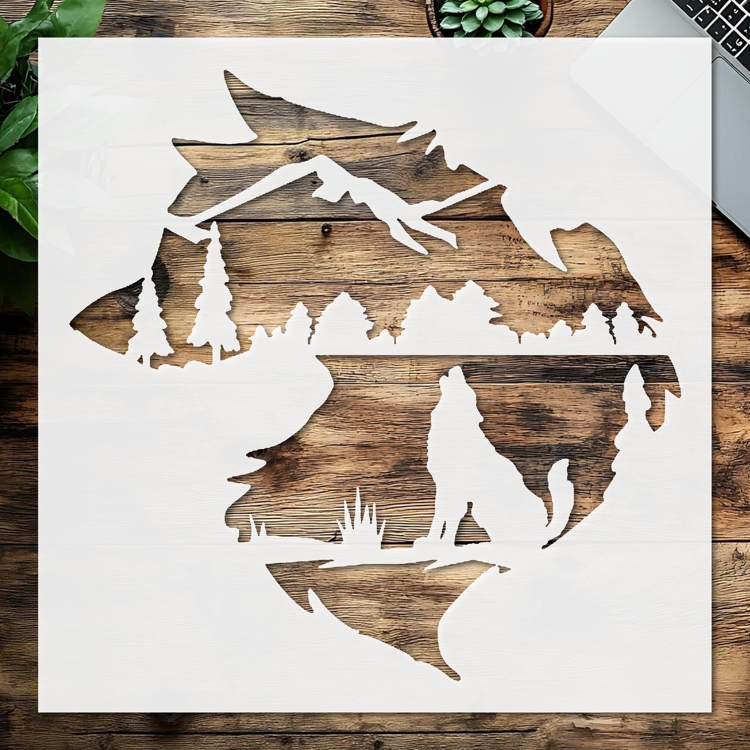 Professional Stencil Wolf Mountains Forest Nature, Plastic Reusable, Reusable Plastic, L x W, for DIY Crafts and Home Decor stencil for creating beautiful designs on various surfaces. Perfect for painting on wood, fabric, walls, and other materials. Reusable and durable for multiple projects.
