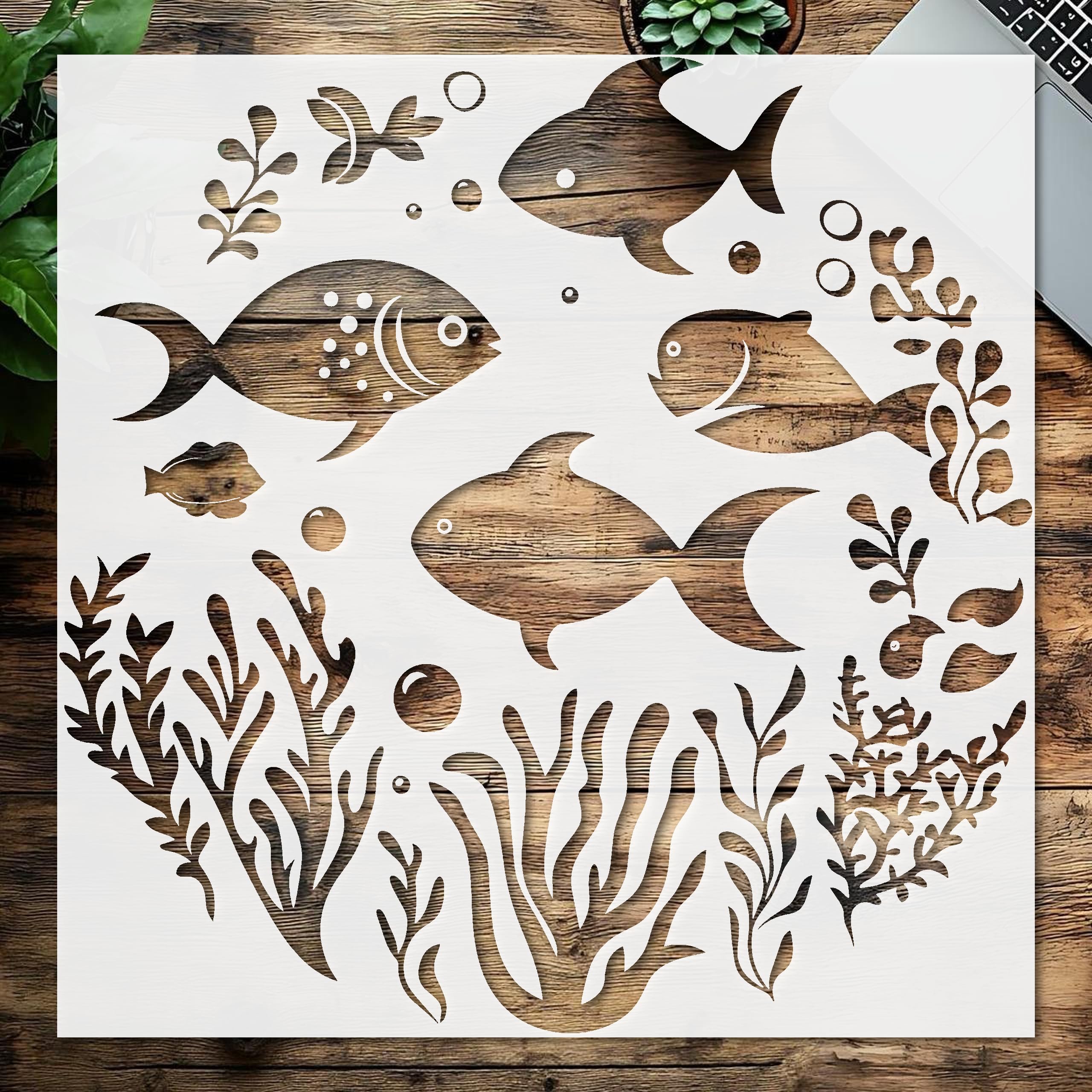 FISHES UNDERWATER STENCIL: This 8.5×11 reusable stencil features a delightful underwater scene, perfect for adding a touch of marine life to your art projects.