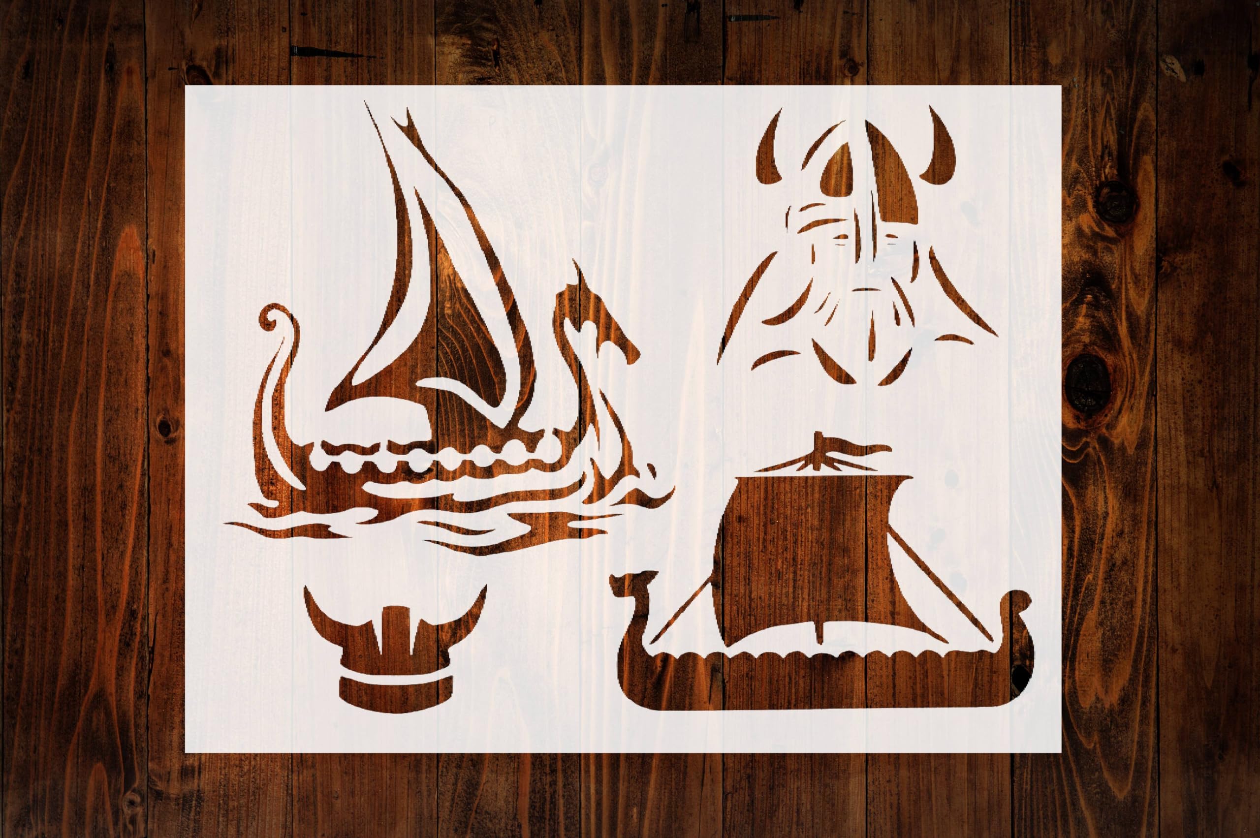 Professional Vikings Ship & Helmet Custom Stencil, Reusable & Sturdy, for Historical Art, Crafts & DIY Projects stencil for creating beautiful designs on various surfaces. Perfect for painting on wood, fabric, walls, and other materials. Reusable and durable for multiple projects.