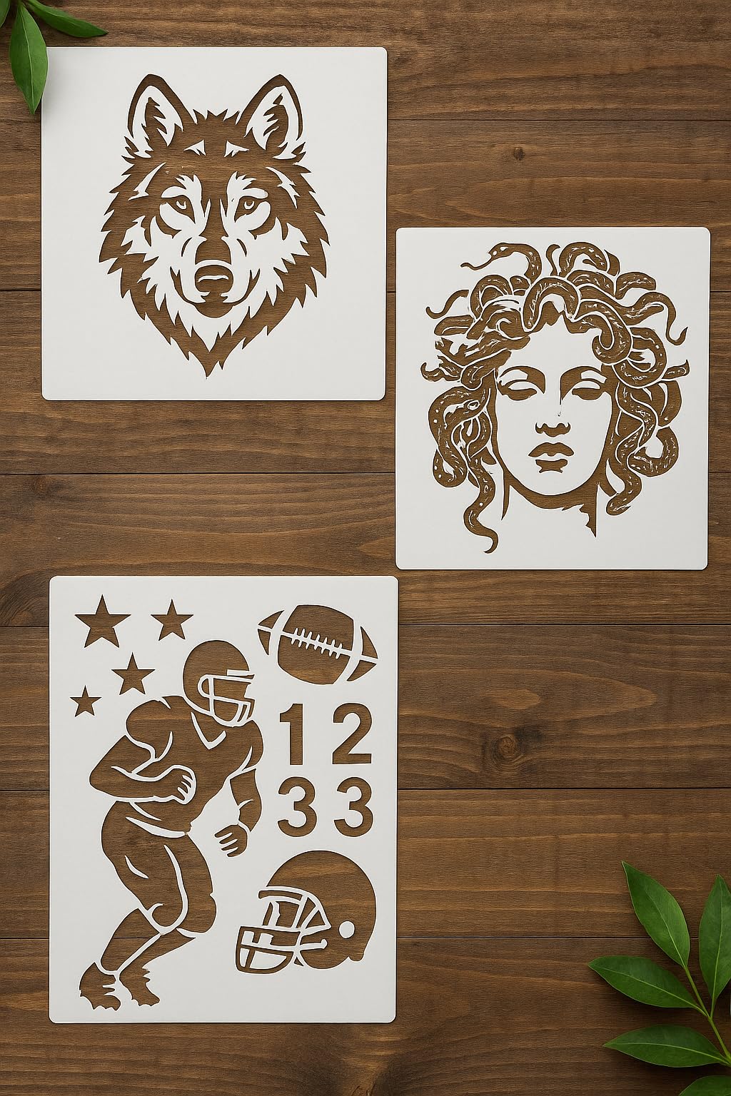 • Bold 4-Stencil Variety Pack – Includes iconic Wolf Head (“), dramatic Medusa, edgy Banksy Rage Bouquet, and a detailed Football-themed stencil (all “) for versatile DIY projects.